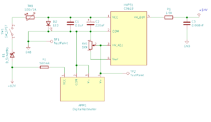 Fig. 1: Schematics of the circuit integrating the Hamamatsu C9619 HV module.