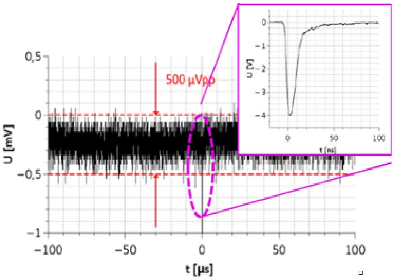 Fig. 3: Baseline of a PMT signal using the designed HVPS with a Hamamatsu R331 PMT and E5859 base. Only very low random noise in the order of 500 μVpp is observed. In comparison, the magnitude of real signals is few volts (see inset).