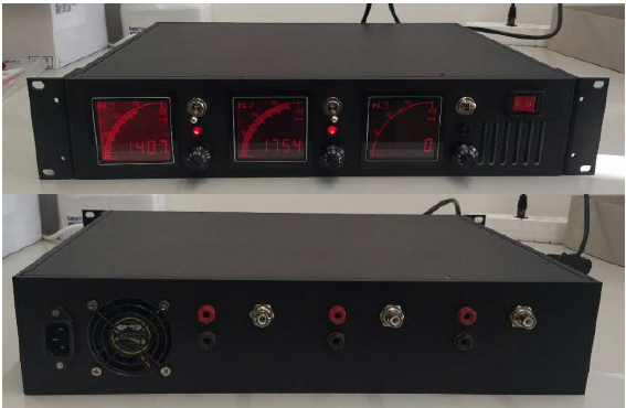 power supply fit in a single 2U 19” rack mountable enclosure (s. Fig. 2). The controls of the power modules are on the front panel. The back panel contains SHV-type plugs for the high voltage output and 4 mm banana jacks to easy monitor the control voltage with external voltmeter. Low-RPM 60 mm fan on the rear prevents overheating.